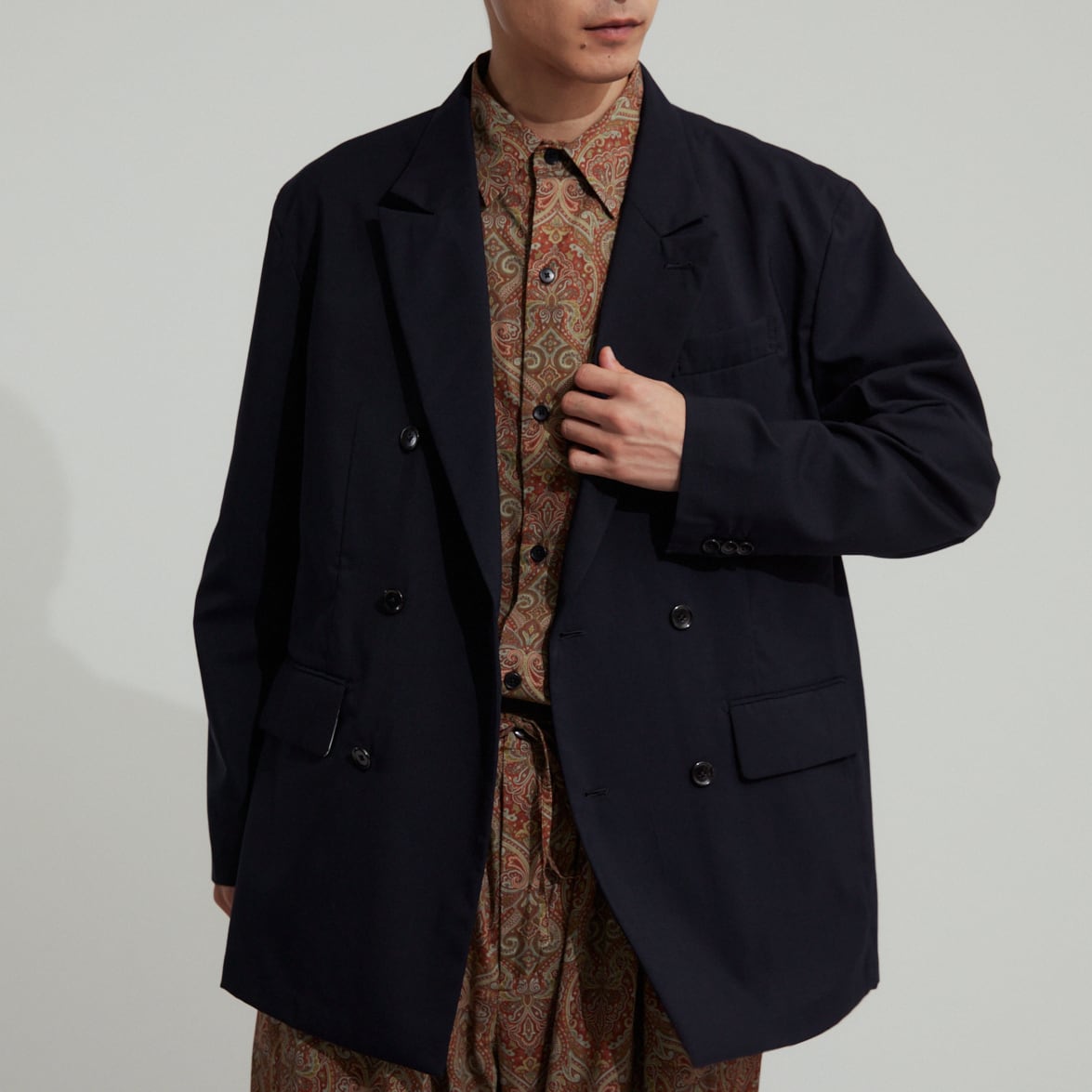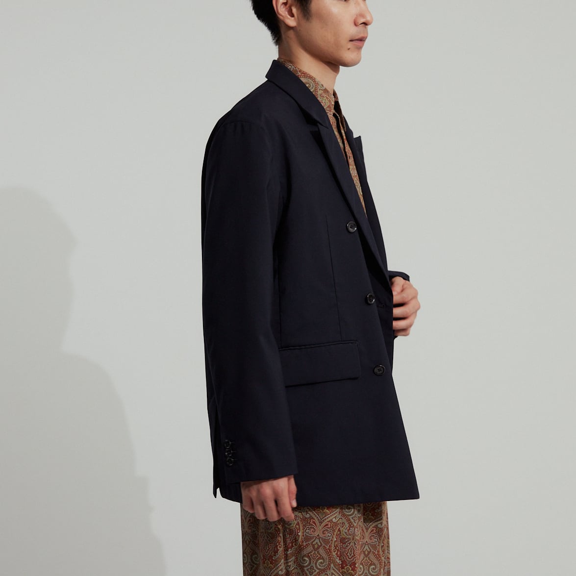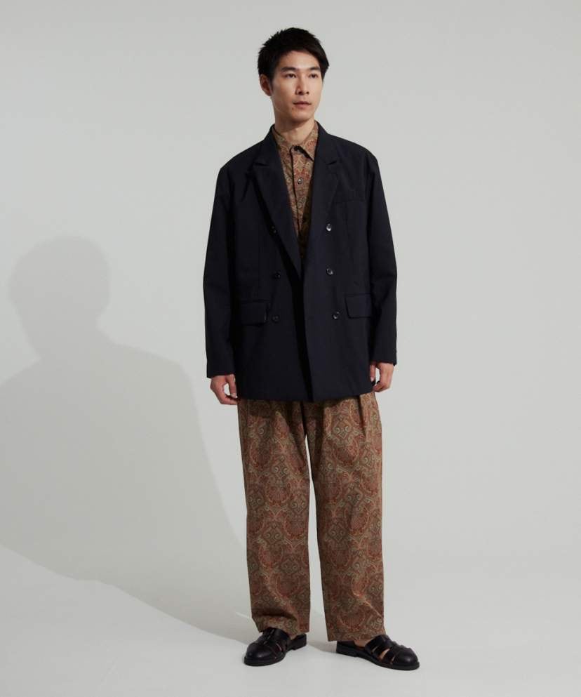 セットアップでのご着用はもちろんおすすめですが、無骨なカーゴパンツやカジュアルなデニム、また柄物などとも大変相性が良く、何を合わせてもコーディネートが品良く仕上がるのが最大の特徴です。