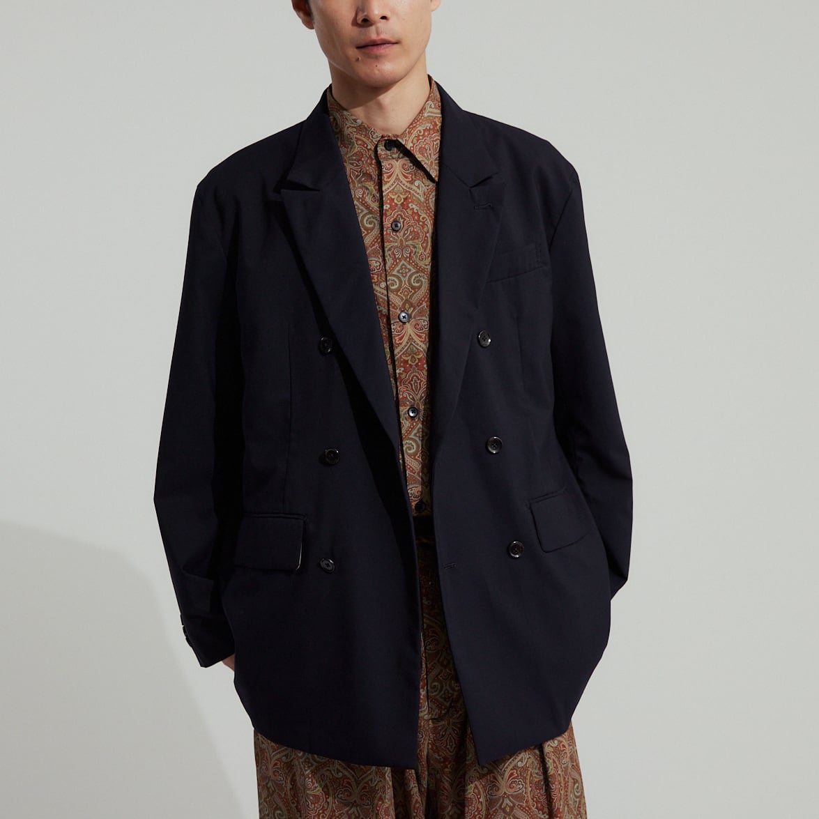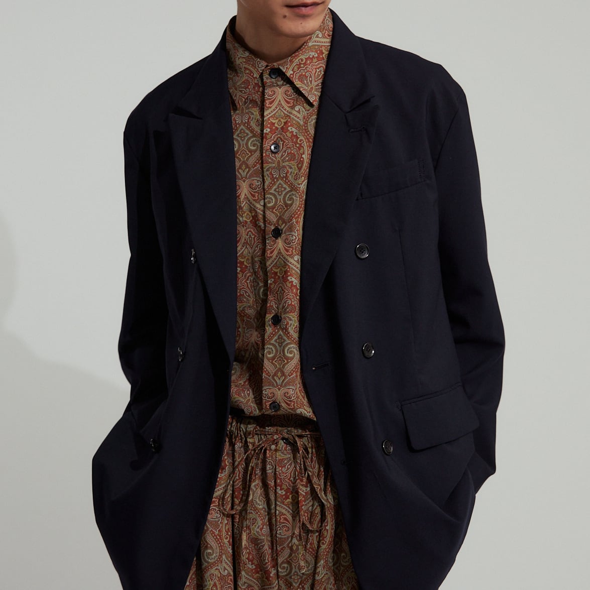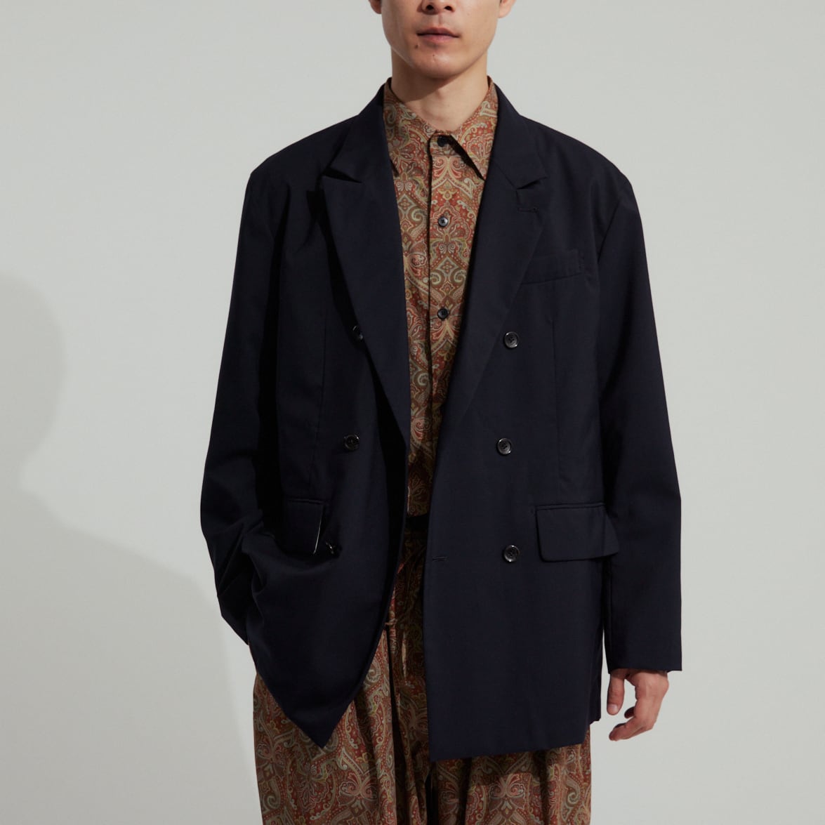 セットアップでのご着用はもちろんおすすめですが、無骨なカーゴパンツやカジュアルなデニム、また柄物などとも大変相性が良く、何を合わせてもコーディネートが品良く仕上がるのが最大の特徴です。