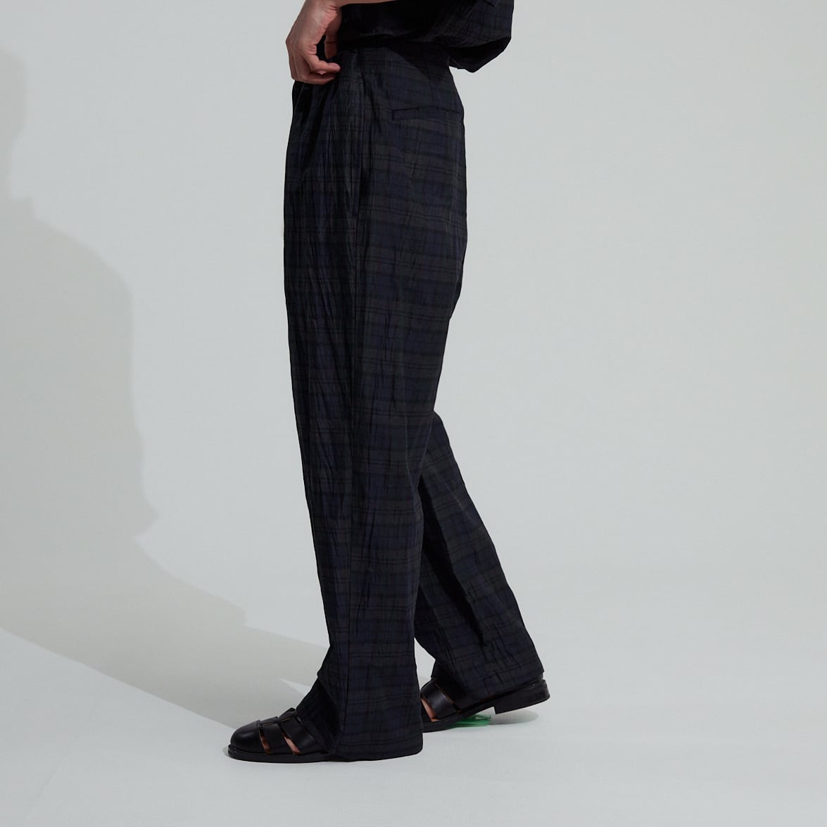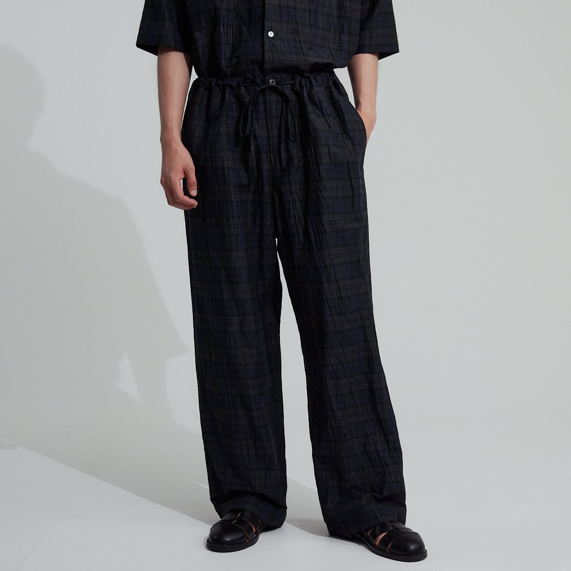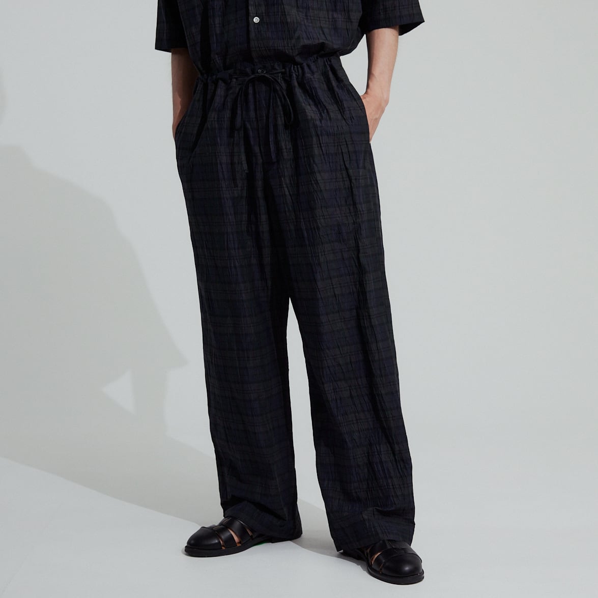 細番手の麻を主体に、コットン、ポリエステルの強撚糸を交織した後ワッシャー加工を施した特別な生地は、独特のシャリ感と控えめな艶があります。