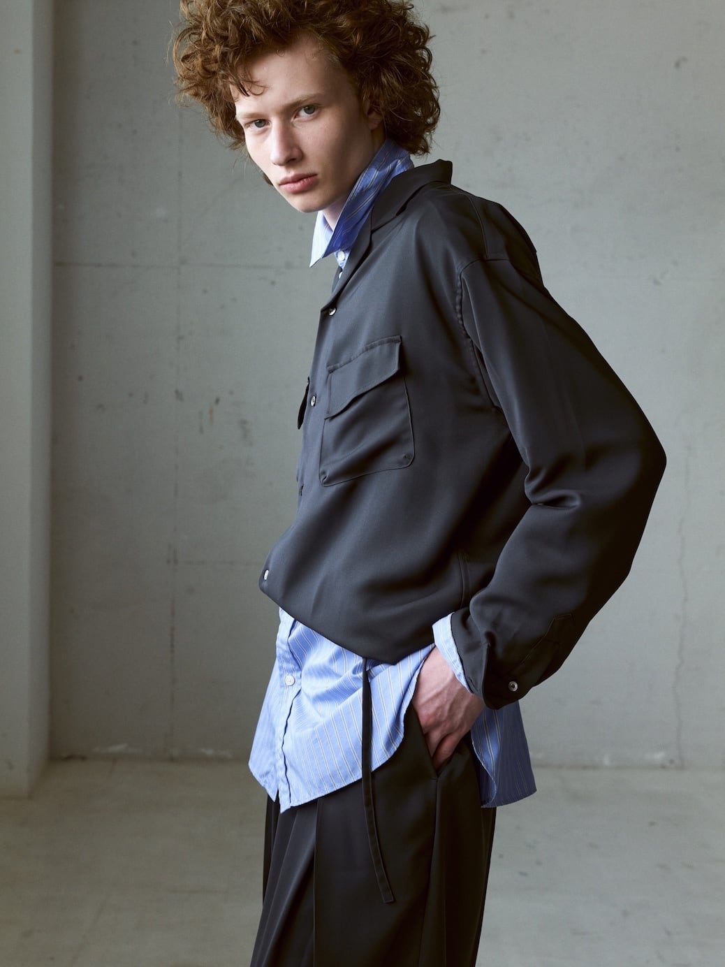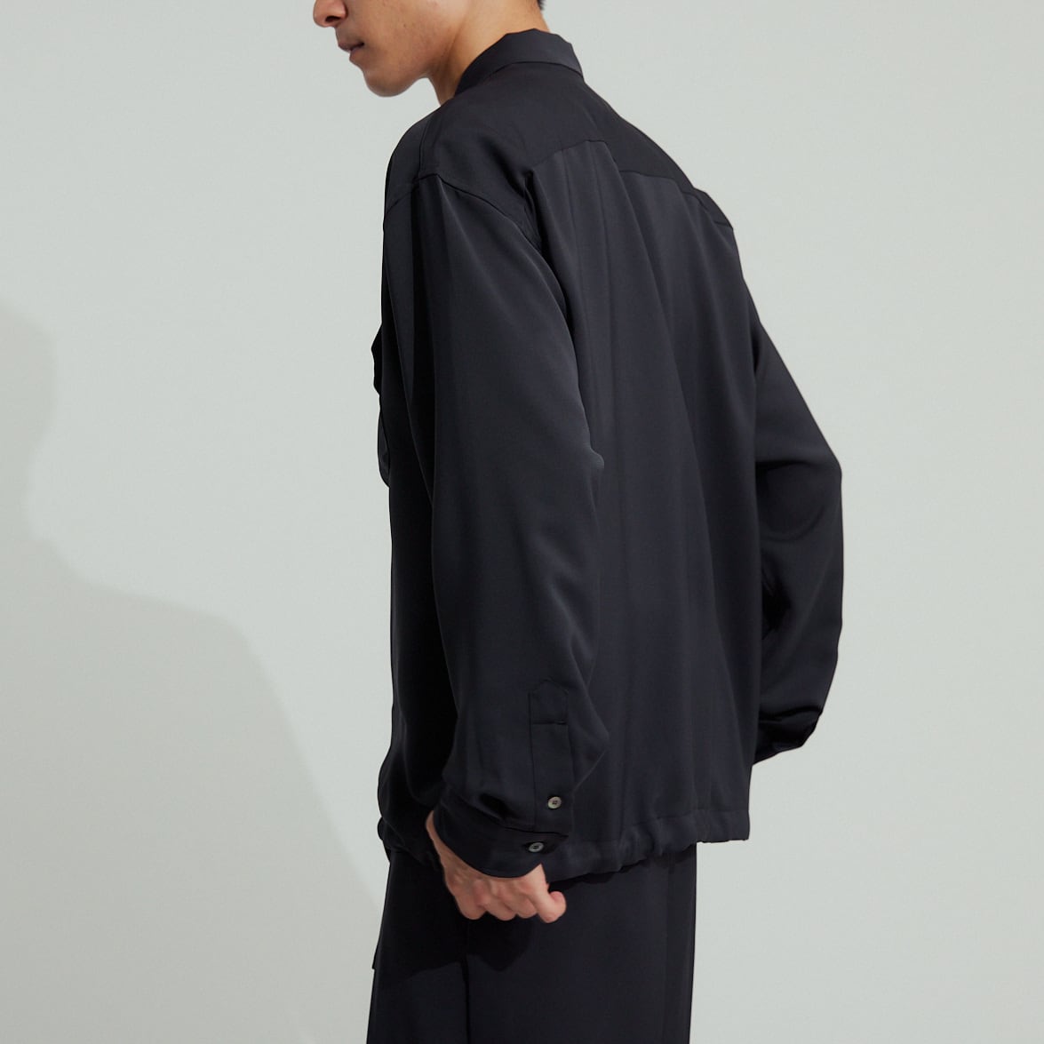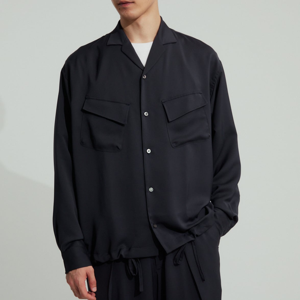 形はゆったりとしたボックスシルエットですが、裾のスピンドルで自在にシルエットを変えることが出来るので、様々な着方が可能です。