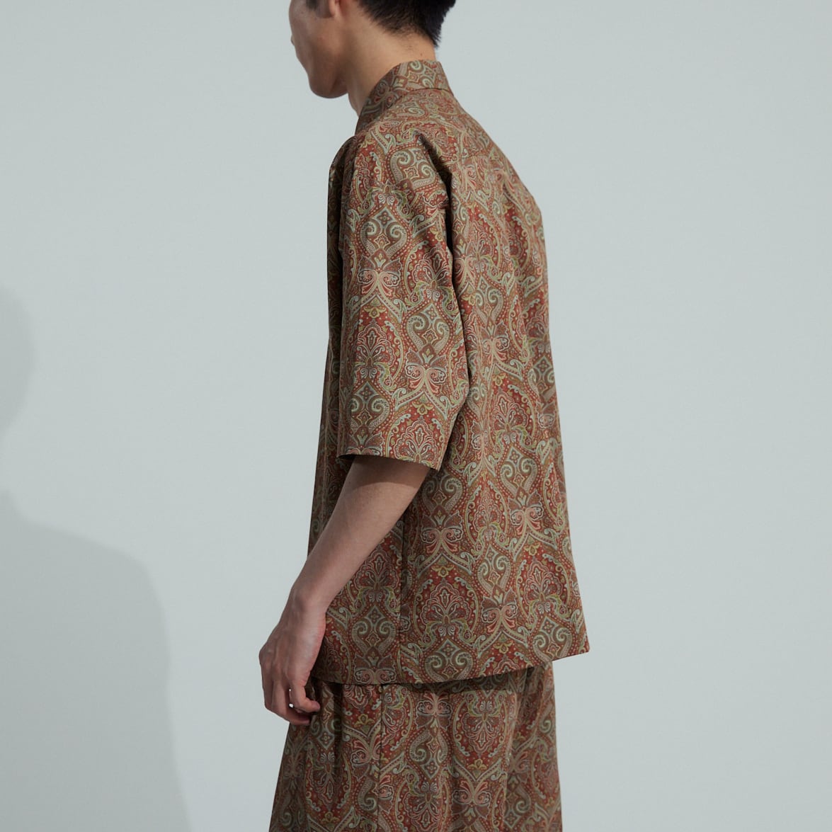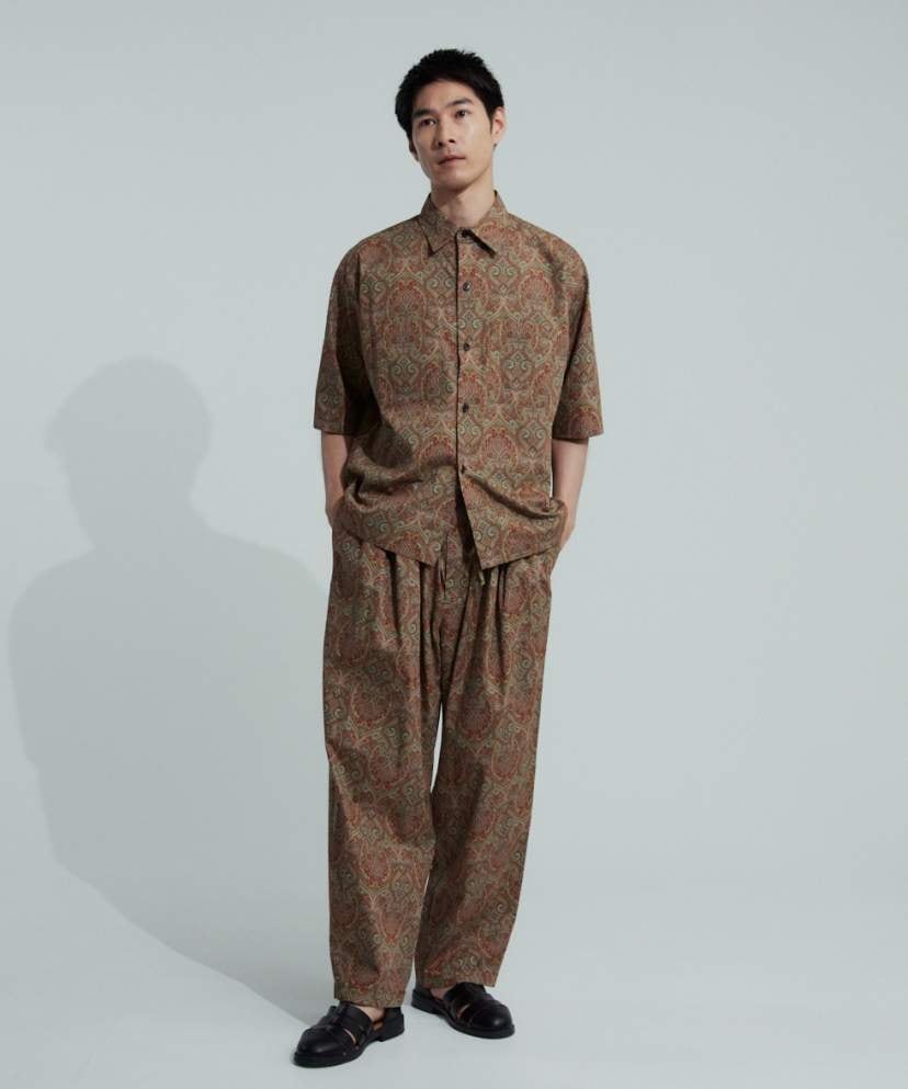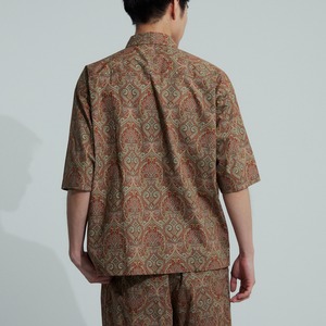 生地には肌触りの優しい国産綿タイプライターをベースに、美しく繊細なペイズリープリントを施しました。全面プリントなので汗染みやシワなども気にせずご着用頂けます。