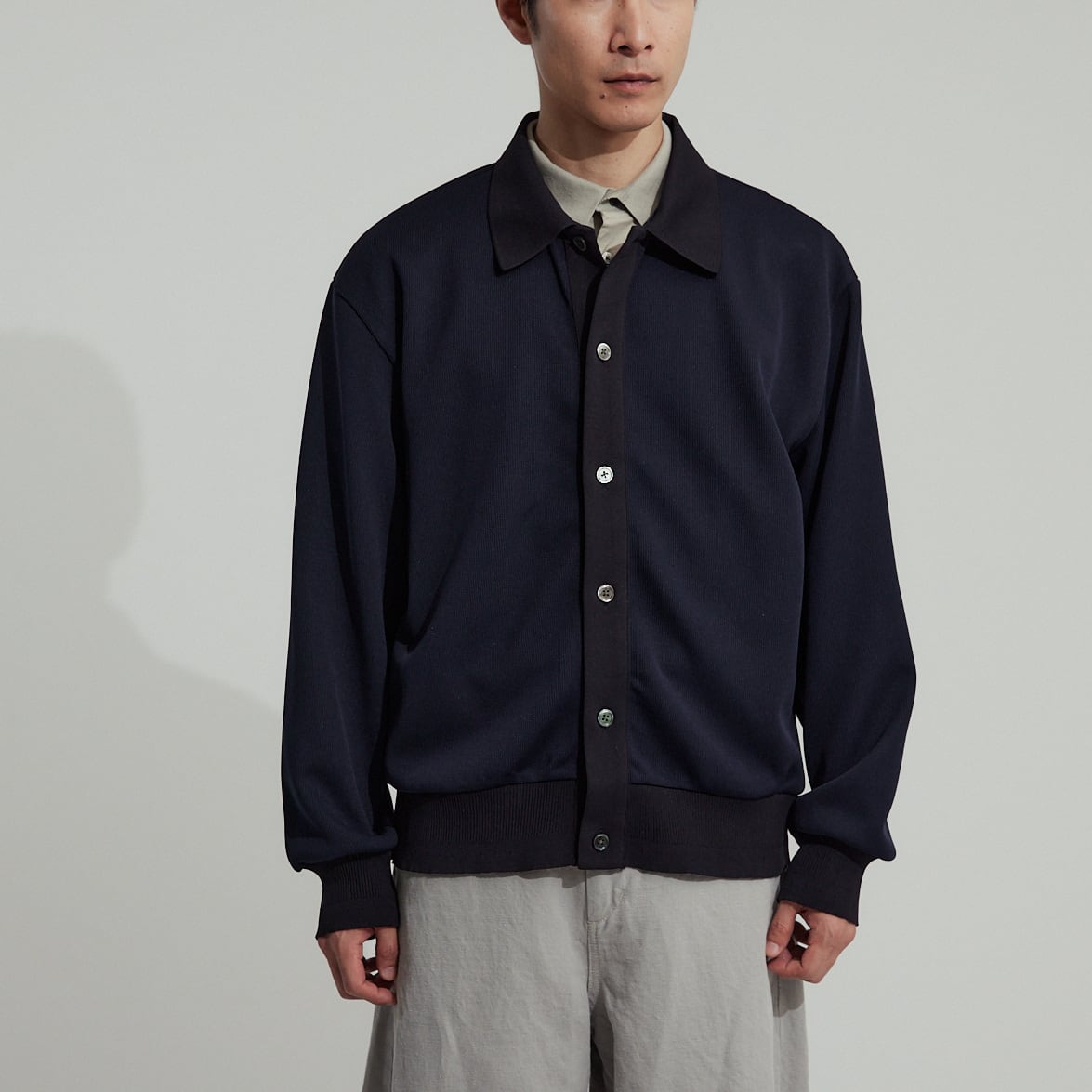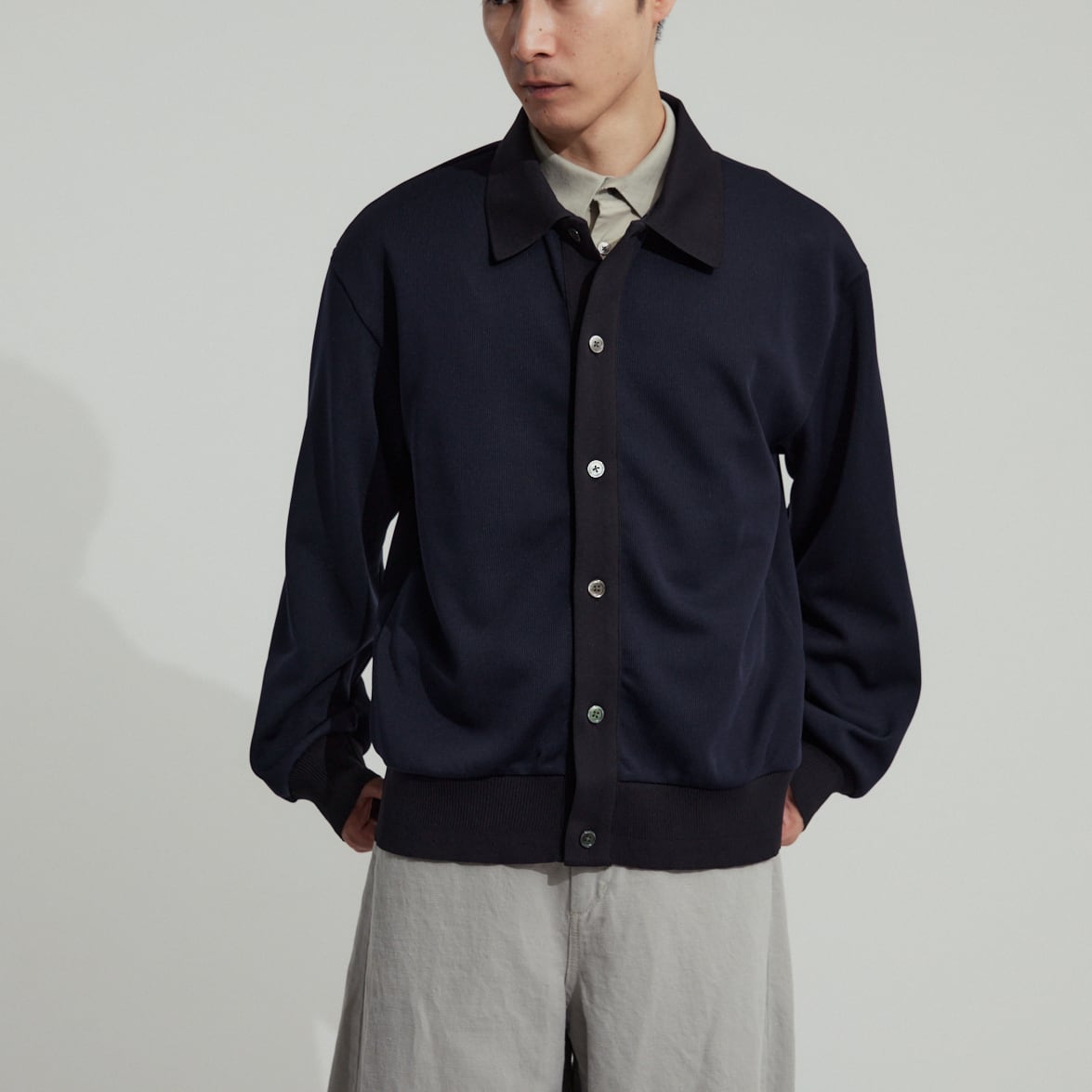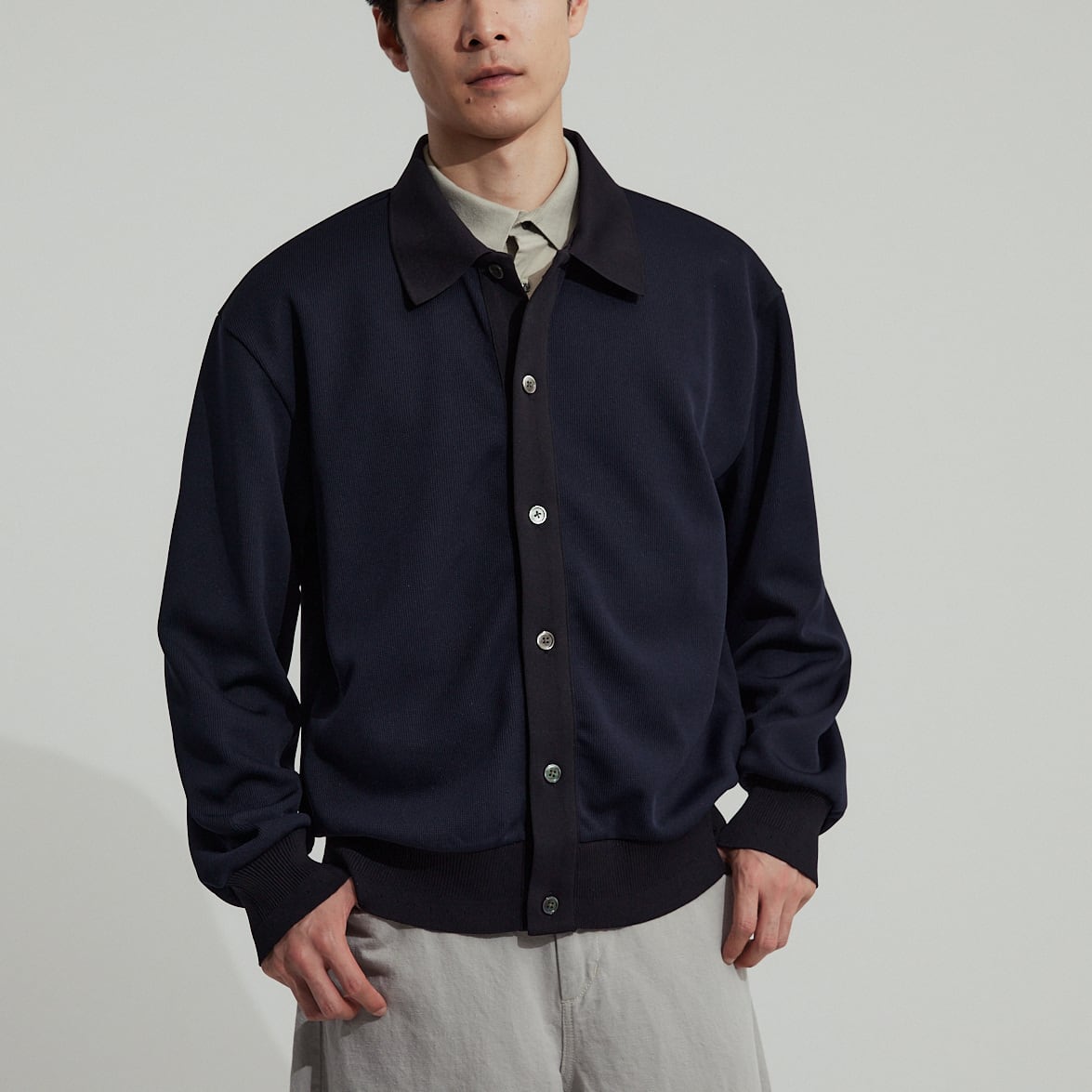衿付きで着こなしの幅が広い新型カーディガン。