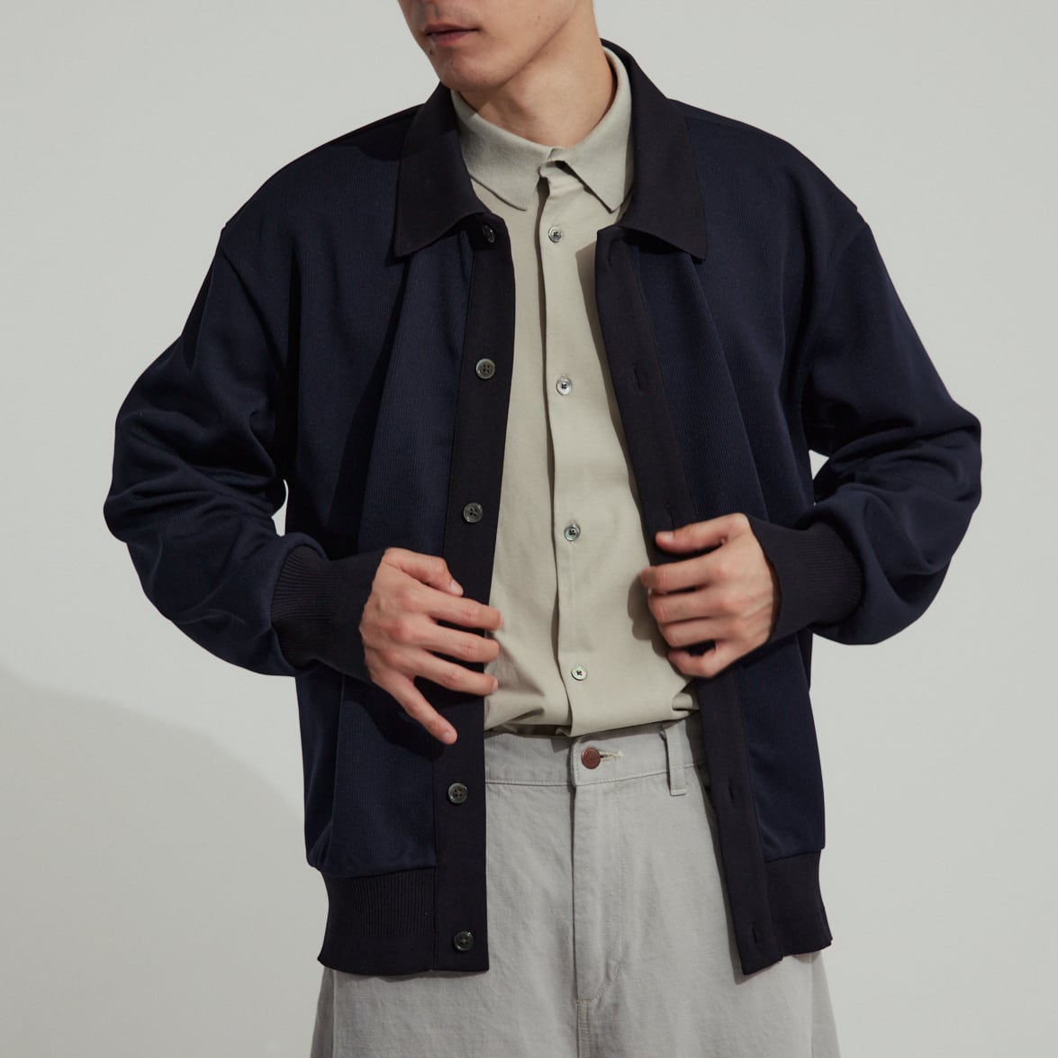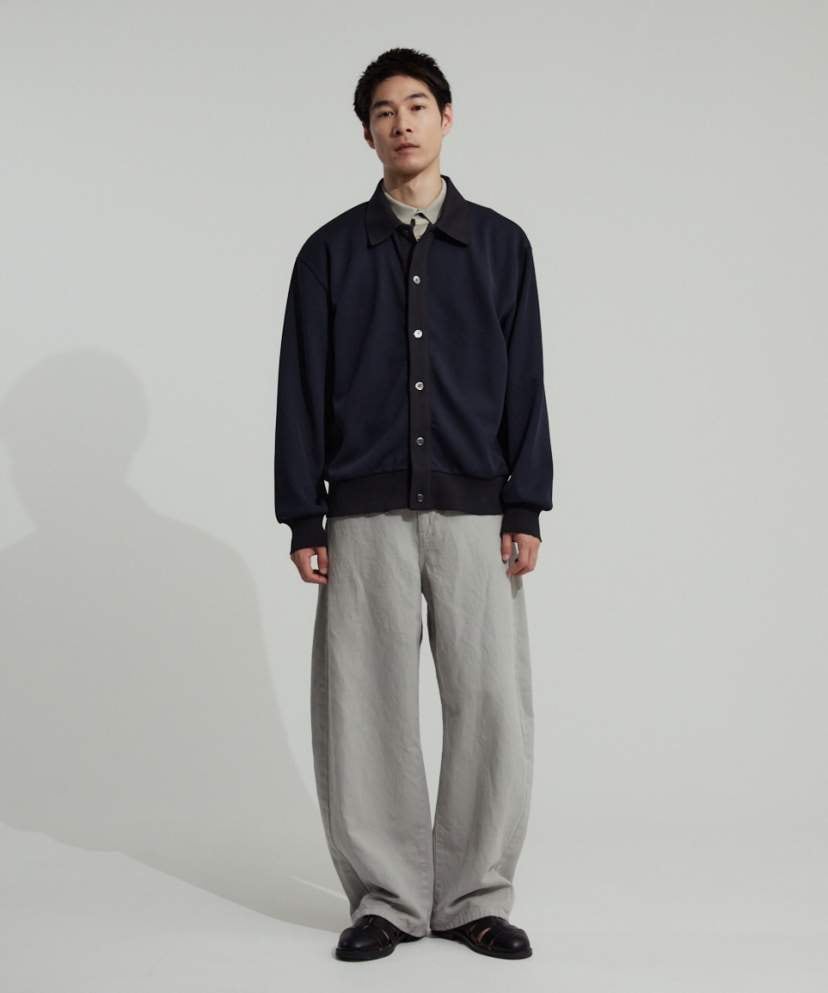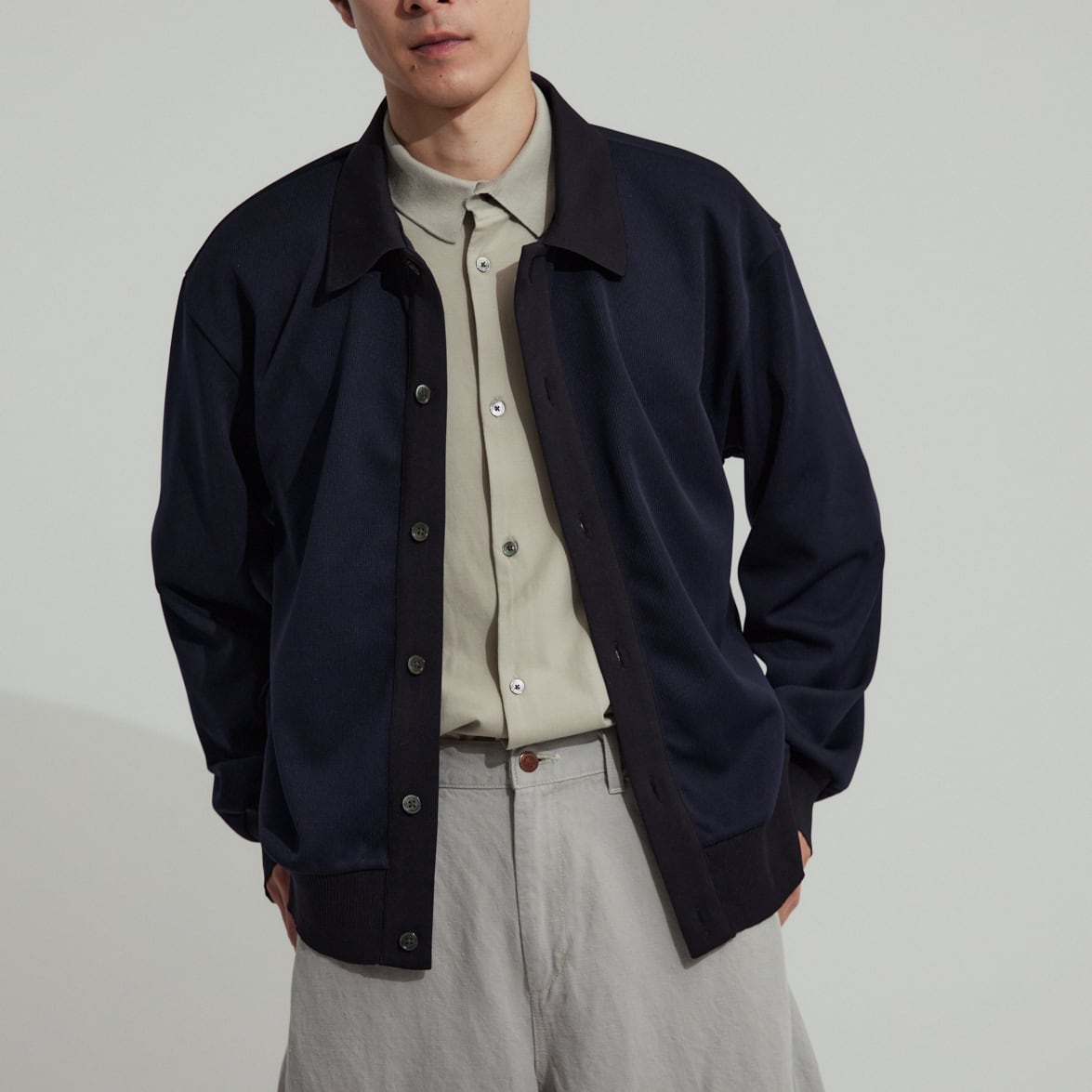 衿付きで着こなしの幅が広い新型カーディガン。