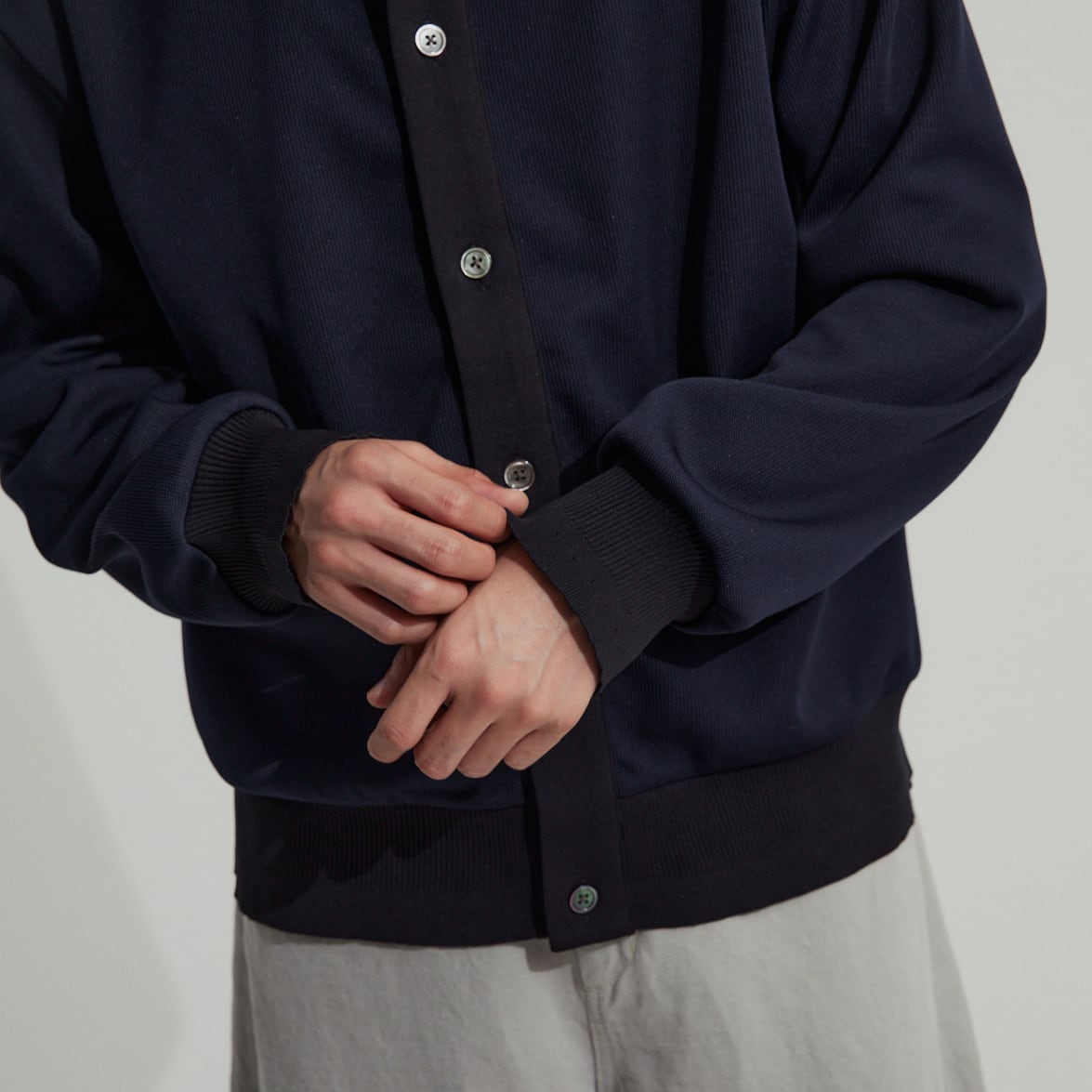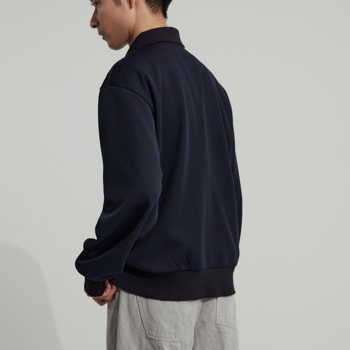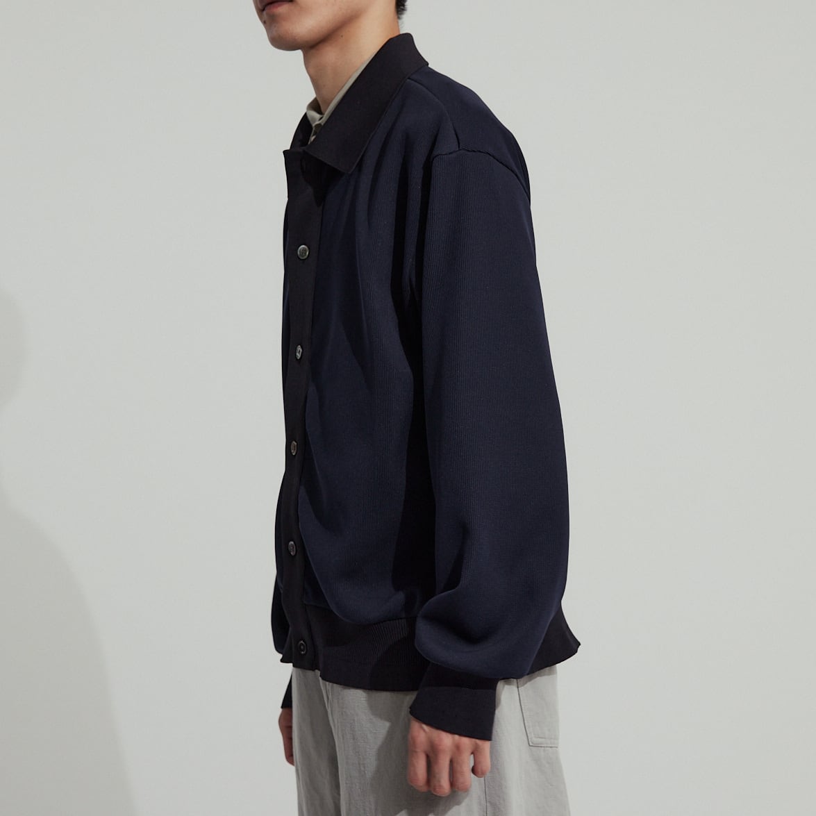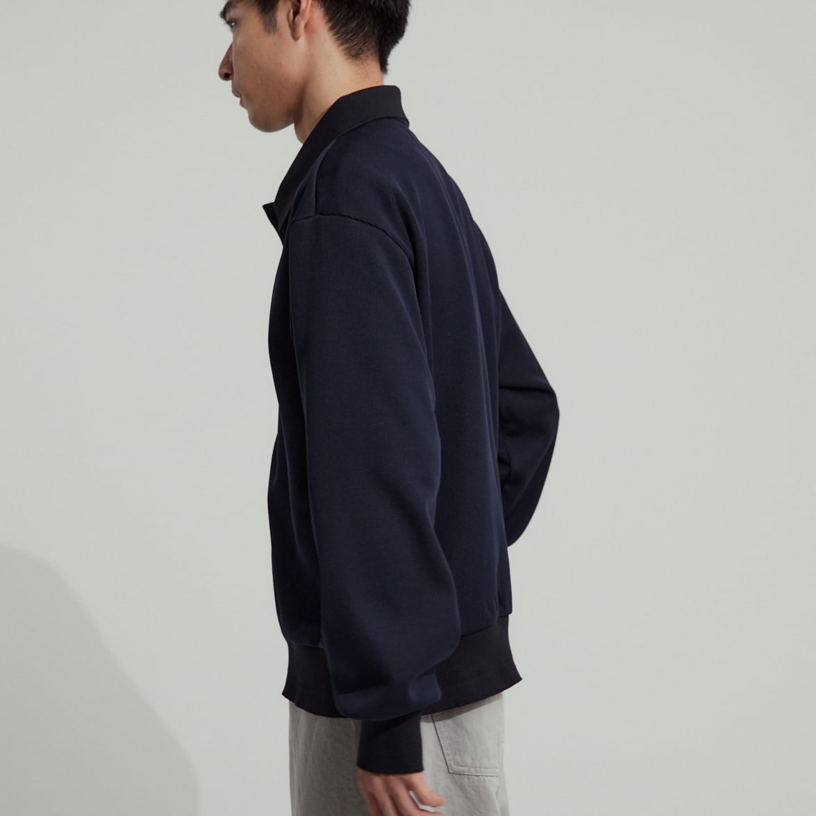 衿と袖口はオリジナルで編み立てた特別なリブがあしらわれており、シンプルながら気の利いたデザインがワンポイントに。こう言った細かなディティールが、高級感と品の良さを生みます。