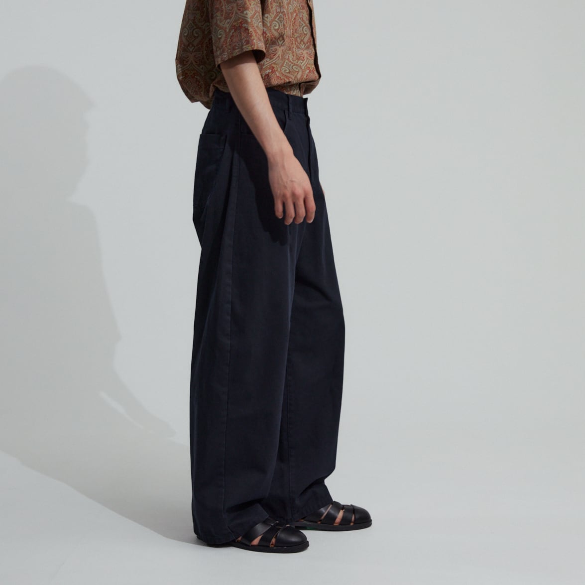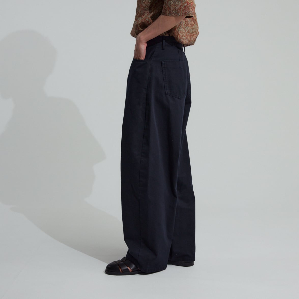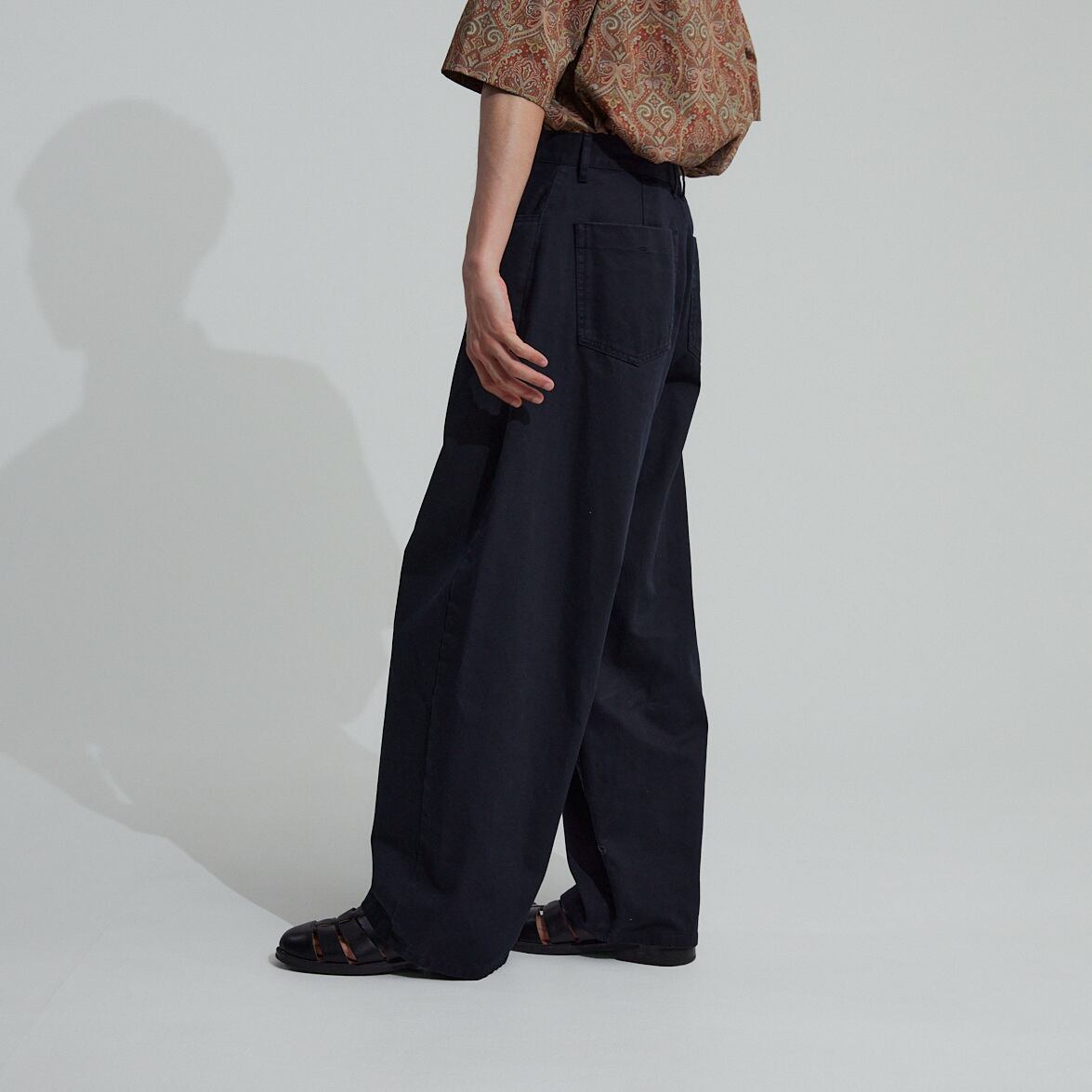 デニム素材なので一見カジュアルですが、程よく落ち感が出る様に生地選びや加工を施しているので、一味違った大人な空気感があります。