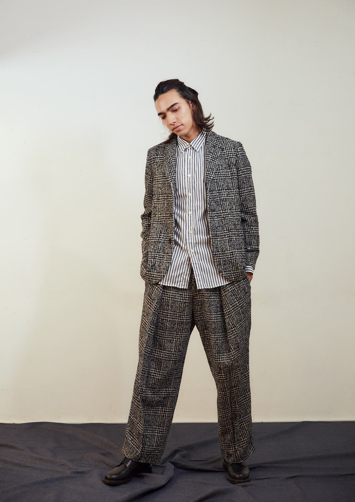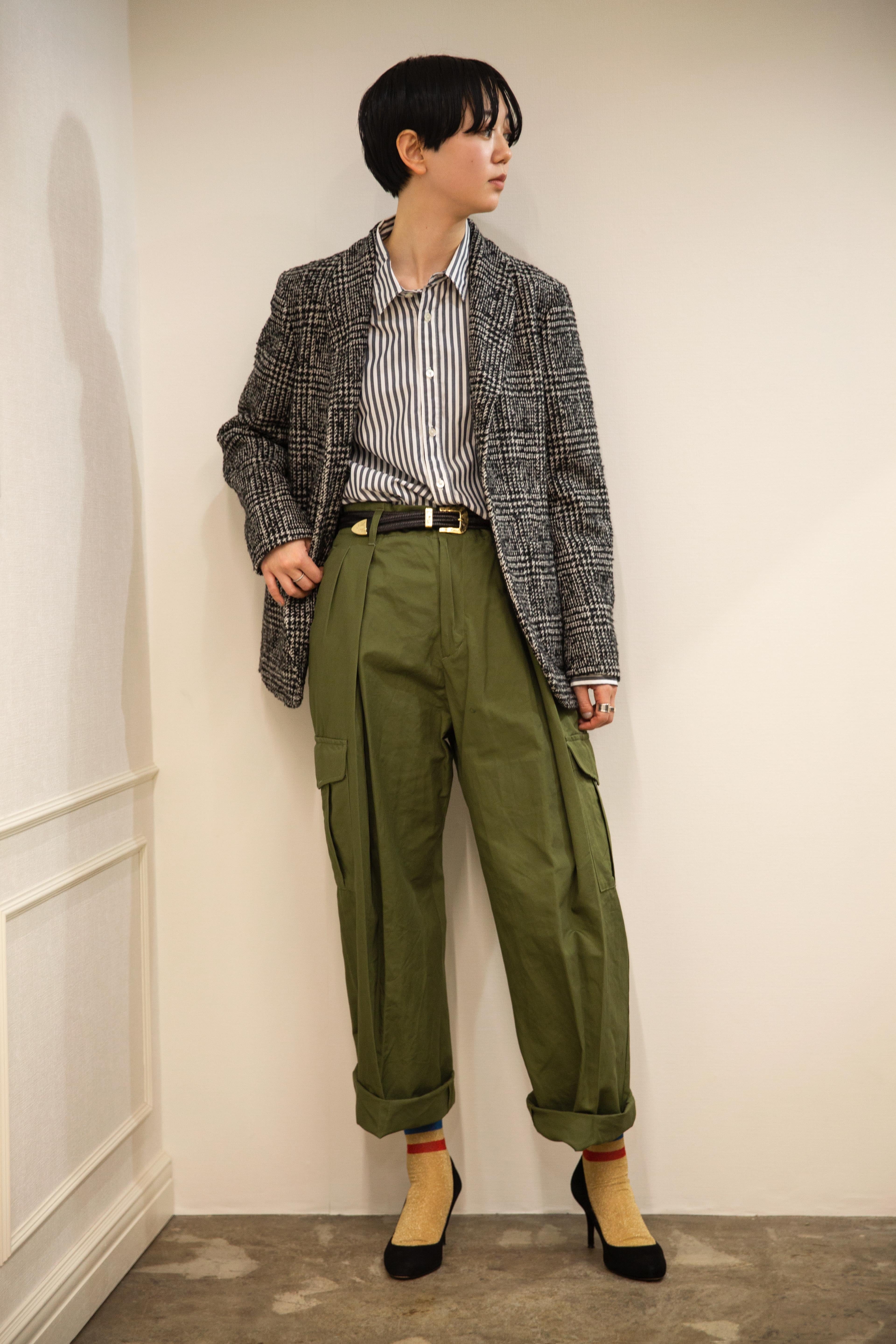 同生地の「TWEED GREN CHECK DOUBLE TUCK PANTS / ツイードグレンチェックダブルタックパンツ」とのセットアップもおすすめです。