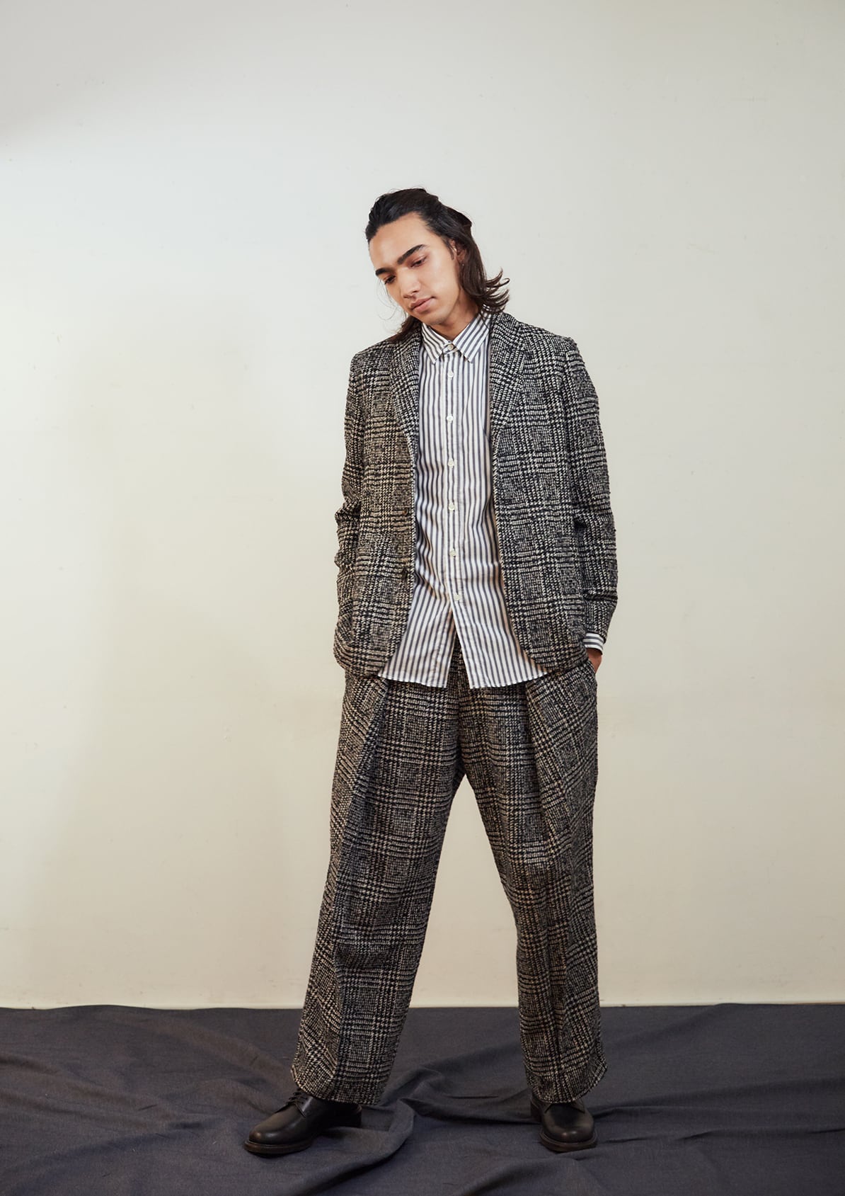尾州で織られたヘビーで肉厚なツイード生地は一着で様になります。