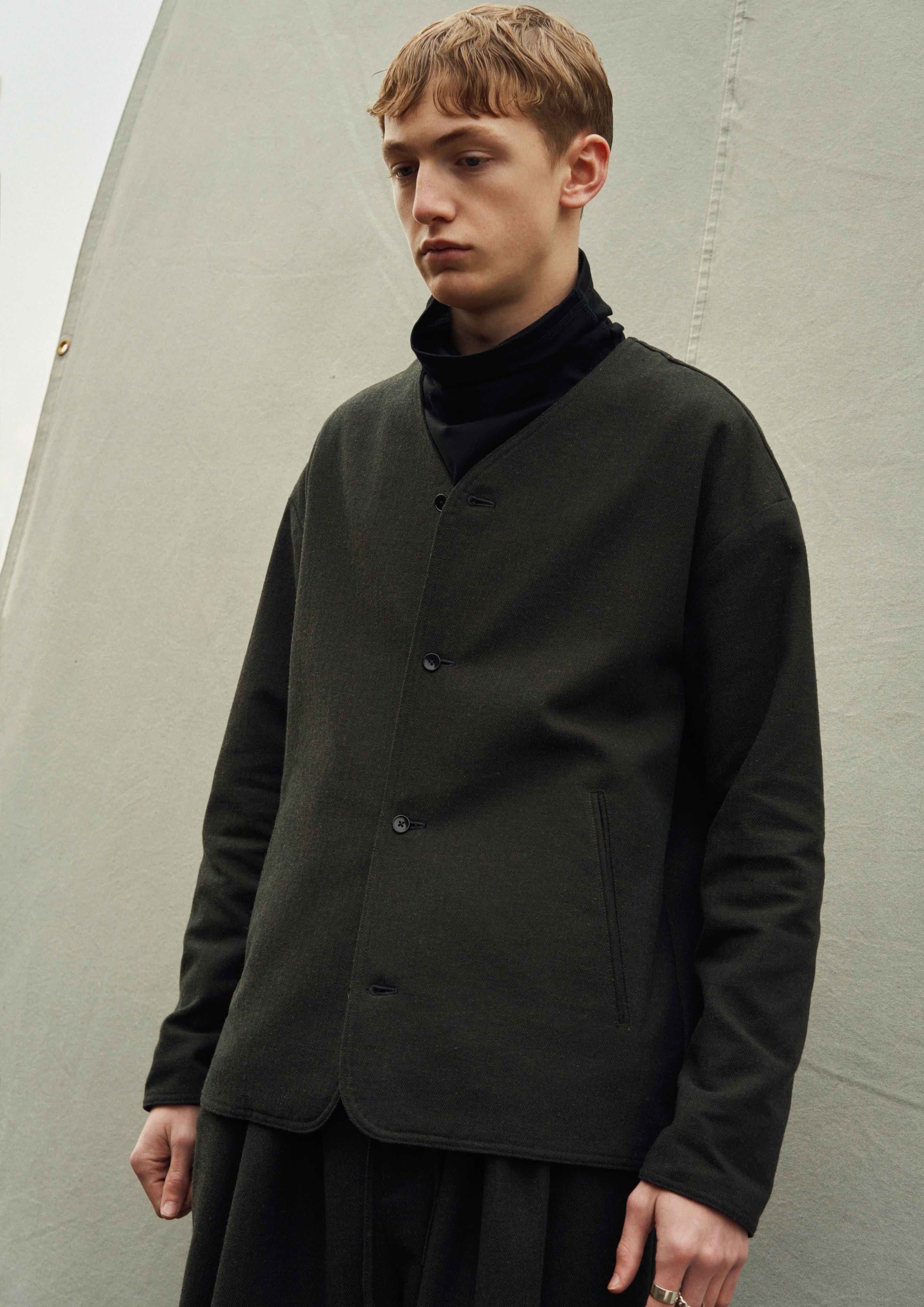 同生地の「C/W HERRINGBORN NO COLLAR JACKET / 綿ウールヘリンボーンノーカラージャケット」とセットアップで揃えるのもおすすめです。