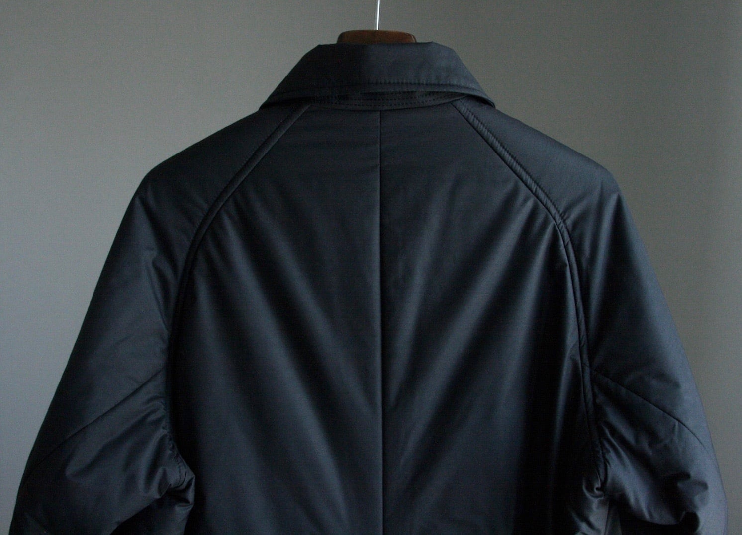 ファスナーではなくボタン留めにしたフロントデザインや、フラップ付きのポケットの形状を採り入れるにあたり、ダウン特有のアウトドア感を一切排除。それはスーツの上に着用してもしっくりくるほどです。