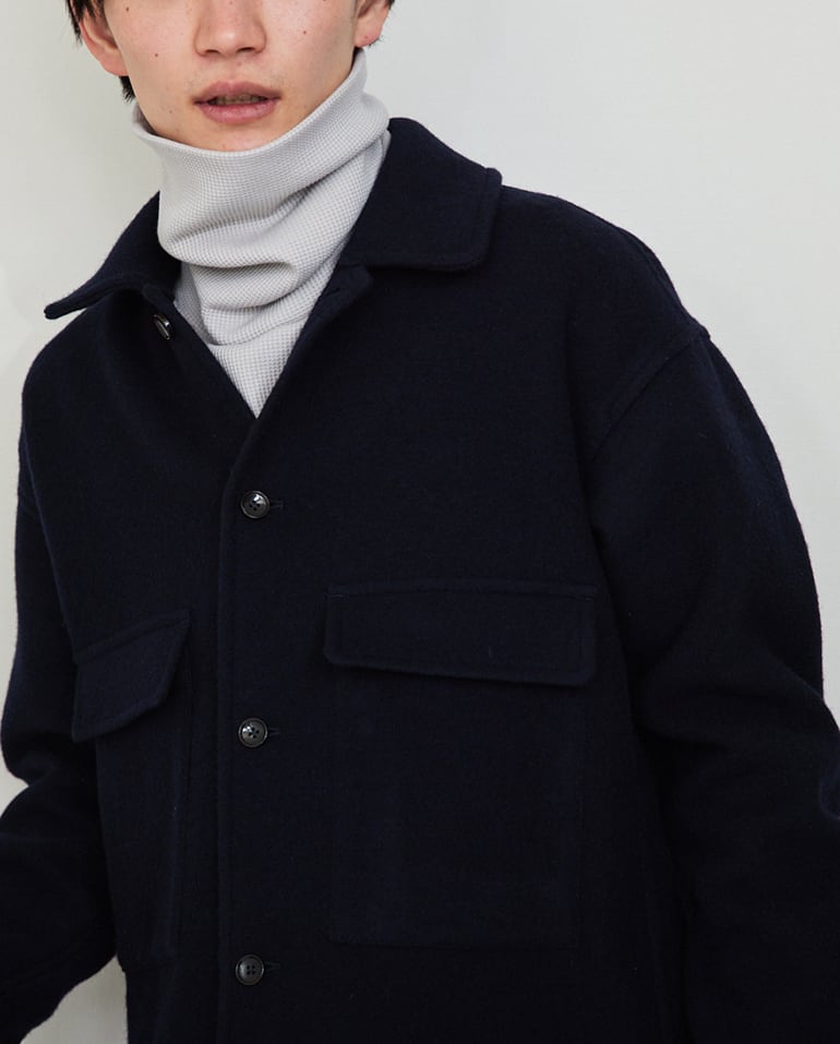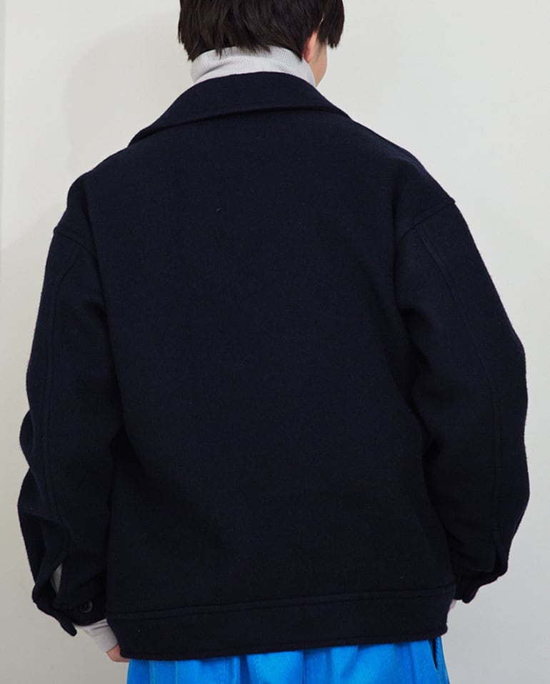 仕上げにはアザミ起毛機(※)を使用し、毛足の長いビーバーとしっかり落ち着いたメルトンの間のような柔らかな風合いに仕上がりました。(※植物である天然アザミを使用した起毛機)