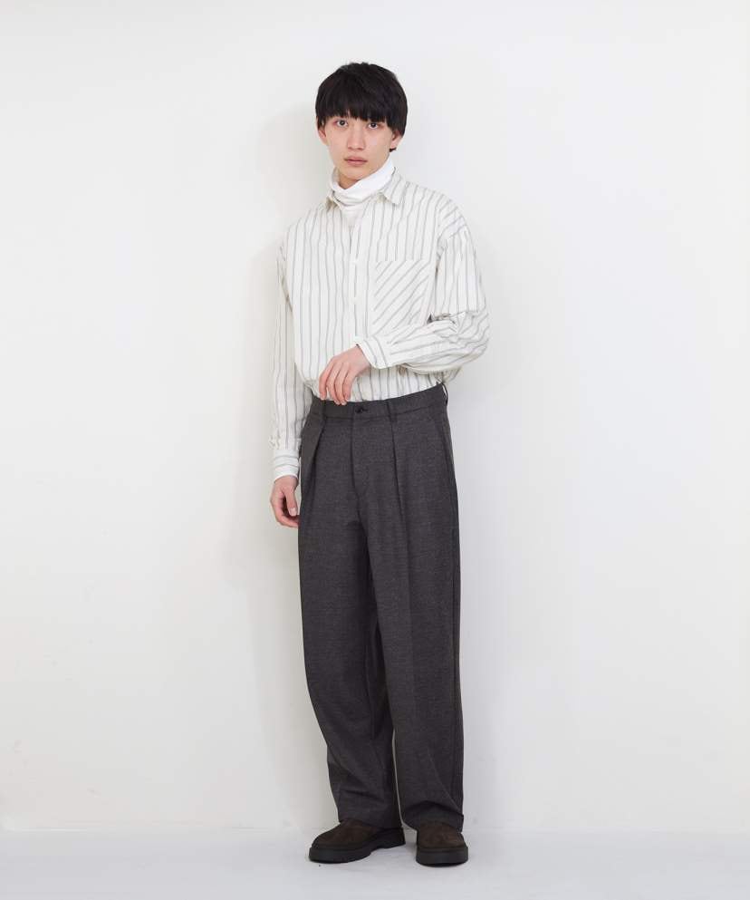ウールの名産地である尾州ならではの技術を駆使した素材は、上質なハイブリッドタイプ。柔らかく温かで、スラックスながらジャージの様な軽やかな穿き心地です。