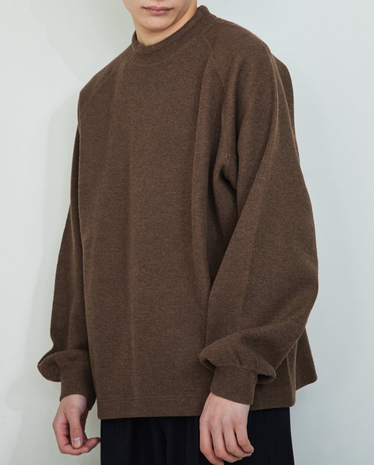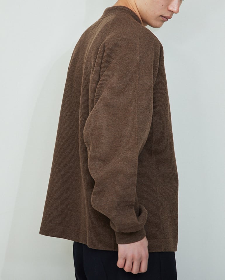 素材は、原料調達・反毛・紡績・織布・整理加工、全ての工程を日本国内で行っているリサイクル紡毛素材『Re:NEWOOL®︎』糸を使用して表綿5GG、裏面20GGのクオーターゲージで編まれたニットを使用。表綿はウール、裏面は綿のダブルフェイスです。